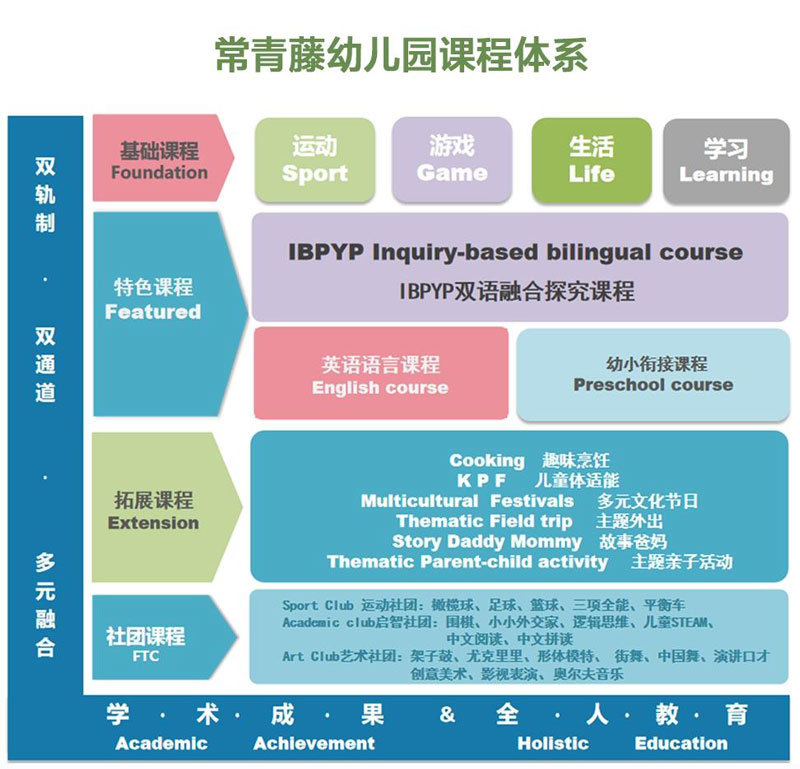 常青藤幼儿园融合二期课改与IB-PYP理念框架,注重语言、数学、科学、艺术、社会、个人社交与体育等六大领域,为幼儿提供高质量的双轨制双通发展的双语教育,无缝衔接常青藤小学,致力于培养乐于创新、充满活力的未来英才。